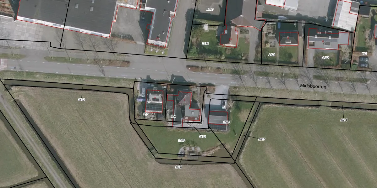 Midsbuorren 1 is gelegen op kadastraal perceel WRG04C956. Deze kadastrale aanduiding is uniek en wordt gebruikt door het Kadaster om eigendomsrechten en andere zakelijke rechten vast te leggen. Het perceel maakt onderdeel uit van de kadastrale gemeente Warrega.