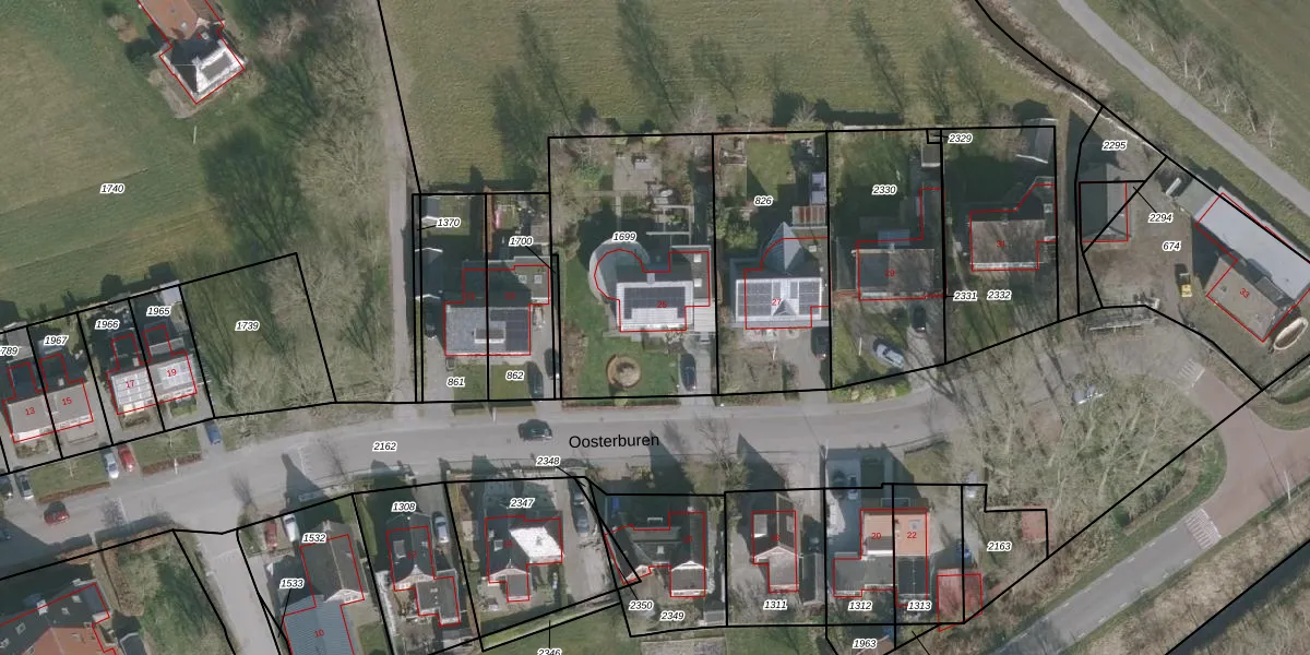 Het perceel waarop Oosterburen 25 staat heeft een oppervlakte van 975 m². Dit is een groot perceel. De perceeloppervlakte wordt geregistreerd door het Kadaster. Gedetailleerde informatie over de maten van dit perceel kunt u vinden in het rapport Kadastrale kaart met maatvoering van Oosterburen 25.