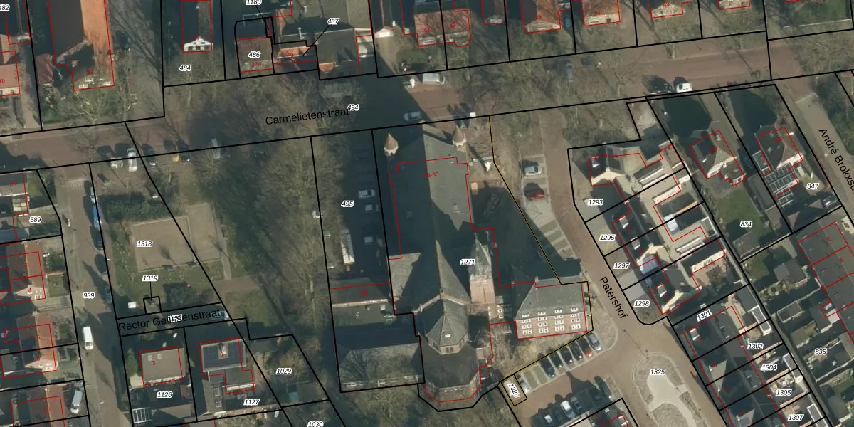 Het perceel waarop Carmelietenstraat 58-m staat heeft een oppervlakte van 2142 m². Dit is een zeer groot perceel. De perceeloppervlakte wordt geregistreerd door het Kadaster. Gedetailleerde informatie over de maten van dit perceel kunt u vinden in het rapport Kadastrale kaart met maatvoering van Carmelietenstraat 58-m.