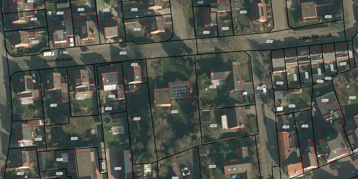Het perceel waarop Emondsstraat 1 staat heeft een oppervlakte van 1465 m². Dit is een zeer groot perceel. De perceeloppervlakte wordt geregistreerd door het Kadaster. Gedetailleerde informatie over de maten van dit perceel kunt u vinden in het rapport Kadastrale kaart met maatvoering van Emondsstraat 1.
