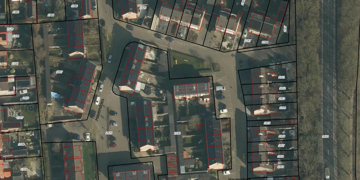 Het perceel waarop Havendries 21 staat heeft een oppervlakte van 4101 m². Dit is een zeer groot perceel. De perceeloppervlakte wordt geregistreerd door het Kadaster. Gedetailleerde informatie over de maten van dit perceel kunt u vinden in het rapport Kadastrale kaart met maatvoering van Havendries 21.