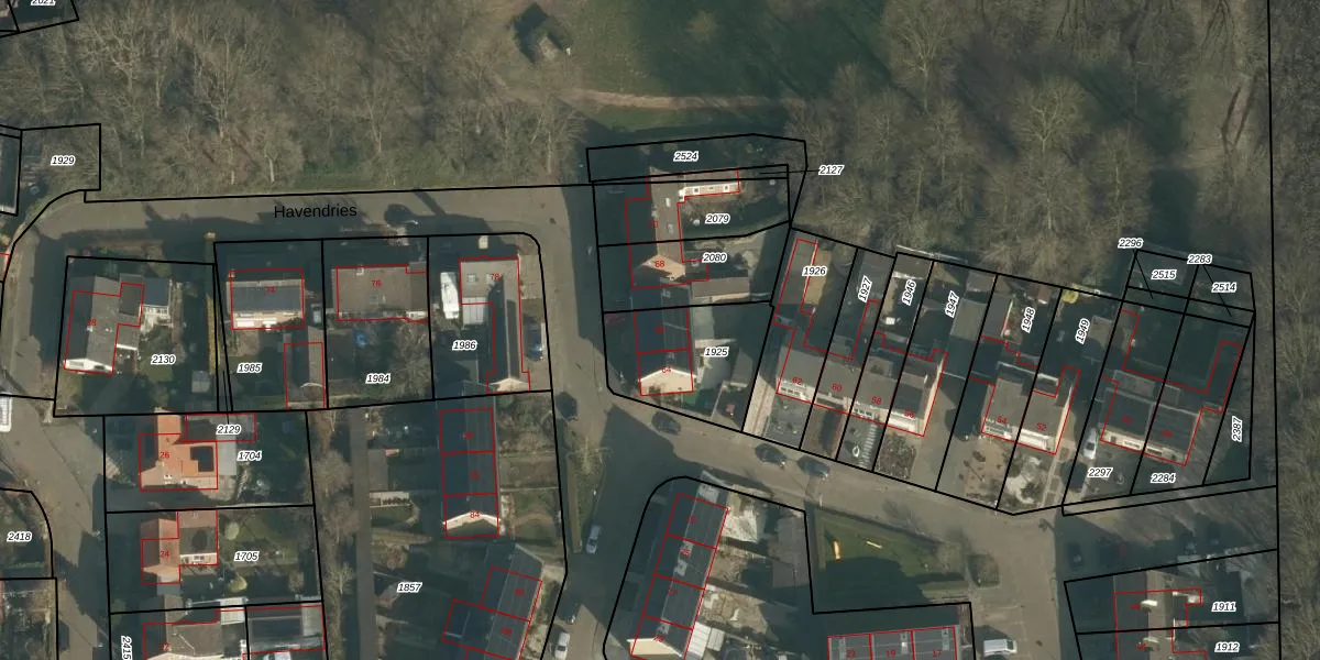 Het perceel waarop Havendries 66 staat heeft een oppervlakte van 381 m². Dit is een groot perceel. De perceeloppervlakte wordt geregistreerd door het Kadaster. Gedetailleerde informatie over de maten van dit perceel kunt u vinden in het rapport Kadastrale kaart met maatvoering van Havendries 66.