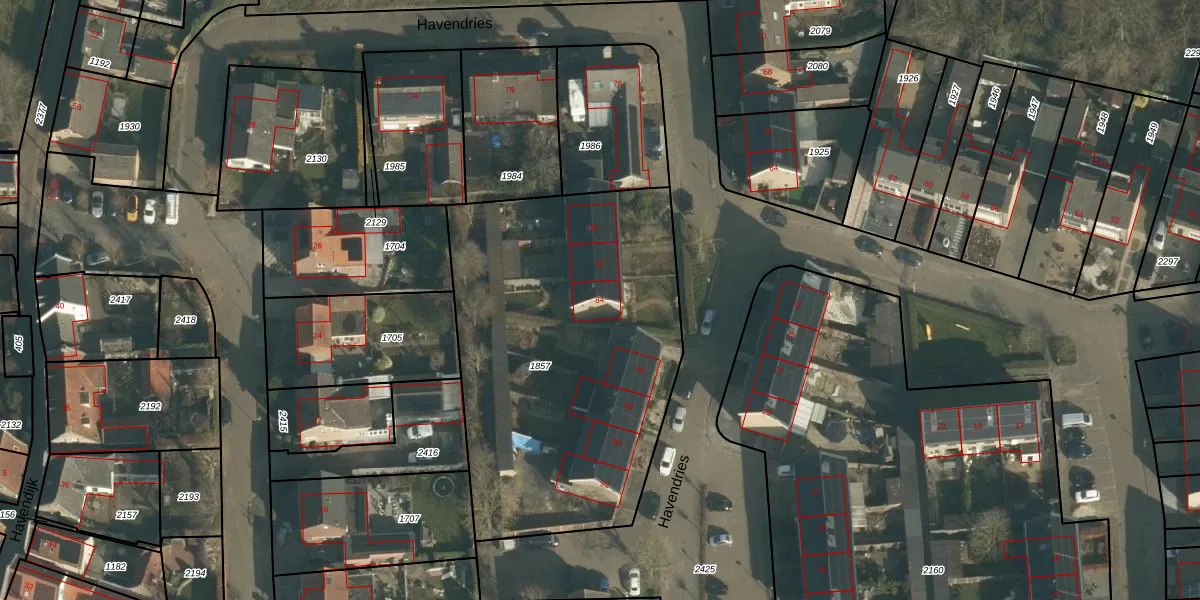 Het perceel waarop Havendries 84 staat heeft een oppervlakte van 1912 m². Dit is een zeer groot perceel. De perceeloppervlakte wordt geregistreerd door het Kadaster. Gedetailleerde informatie over de maten van dit perceel kunt u vinden in het rapport Kadastrale kaart met maatvoering van Havendries 84.