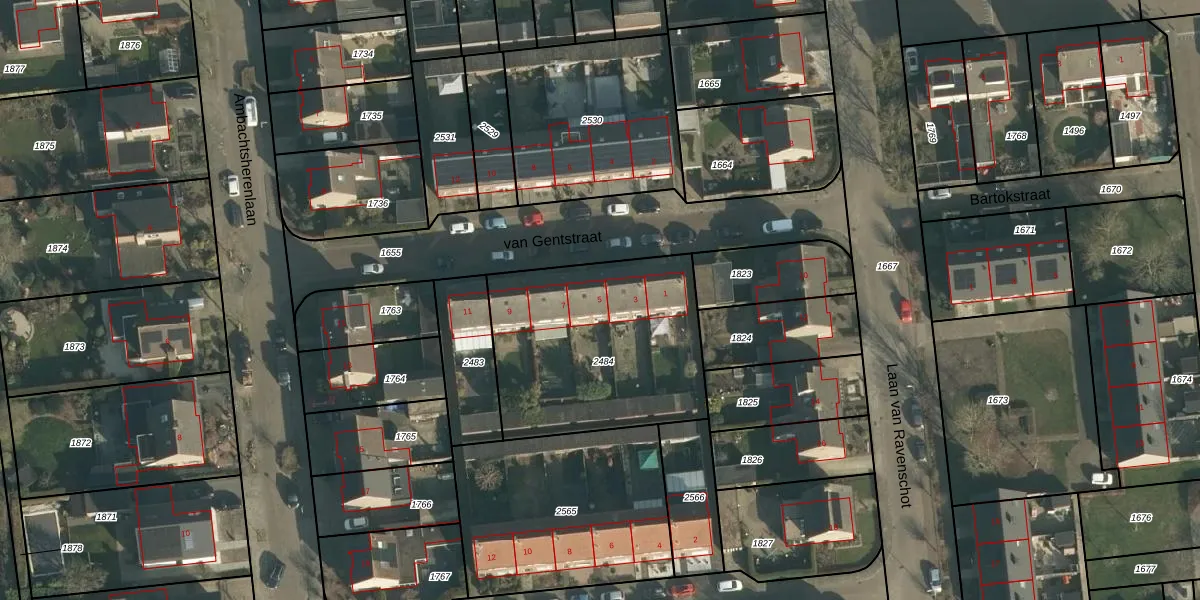 Het perceel waarop van Gentstraat 5 staat heeft een oppervlakte van 951 m². Dit is een groot perceel. De perceeloppervlakte wordt geregistreerd door het Kadaster. Gedetailleerde informatie over de maten van dit perceel kunt u vinden in het rapport Kadastrale kaart met maatvoering van van Gentstraat 5.
