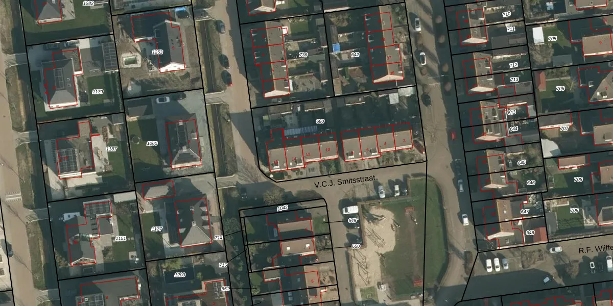 Het perceel waarop V.C.J. Smitsstraat 12 staat heeft een oppervlakte van 1352 m². Dit is een zeer groot perceel. De perceeloppervlakte wordt geregistreerd door het Kadaster. Gedetailleerde informatie over de maten van dit perceel kunt u vinden in het rapport Kadastrale kaart met maatvoering van V.C.J. Smitsstraat 12.