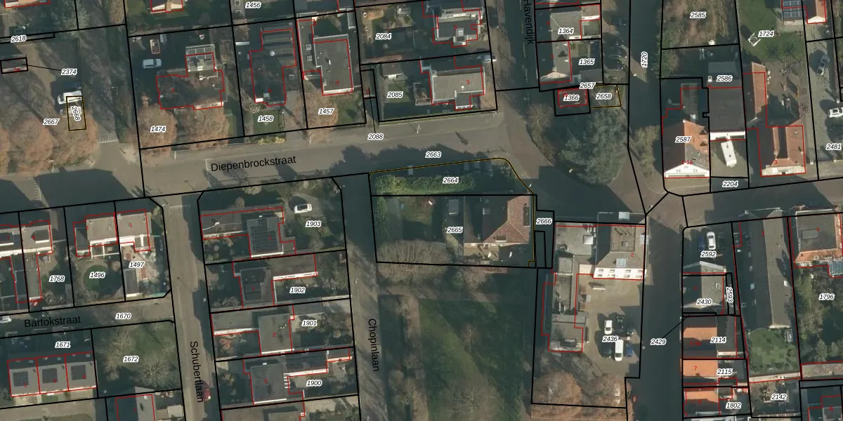 Het adres is gelegen op perceel 2665 in de sectie G en de kadastrale gemeente Waspik. De kadastrale aanduiding is aldus WPK01-G-2665. Het perceel is 623 m² groot. Dat is kleiner dan de gemiddelde perceeloppervlakte in Waspik, dat op 5076,07 m² ligt. Het kleinste perceel in de kadastrale gemeente is 1 m² groot. De grootste perceeloppervlakte is 21,0 ha. Op het perceel liggen in totaal 13 adressen. De huidige grenzen van het perceel zijn digitaal in de Basisregistratie Kadaster (BRK) geregistreerd op 11-10-2024.