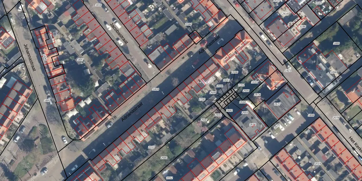 Het perceel waarop Adrianastraat 15 staat heeft een oppervlakte van 2755 m². Dit is een zeer groot perceel. De perceeloppervlakte wordt geregistreerd door het Kadaster. Gedetailleerde informatie over de maten van dit perceel kunt u vinden in het rapport Kadastrale kaart met maatvoering van Adrianastraat 15.