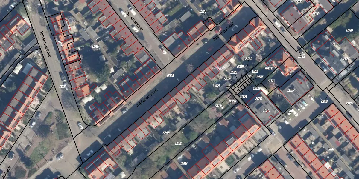 Het perceel waarop Adrianastraat 19 staat heeft een oppervlakte van 2755 m². Dit is een zeer groot perceel. De perceeloppervlakte wordt geregistreerd door het Kadaster. Gedetailleerde informatie over de maten van dit perceel kunt u vinden in het rapport Kadastrale kaart met maatvoering van Adrianastraat 19.