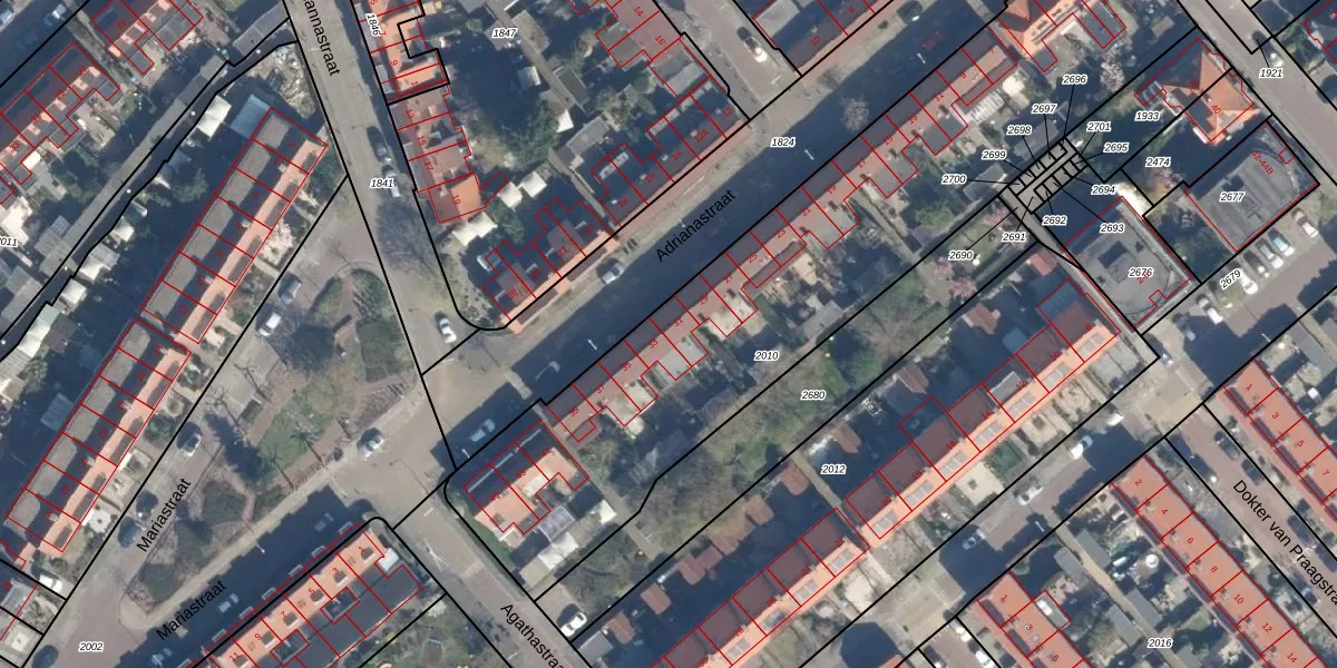 Het perceel waarop Adrianastraat 31 staat heeft een oppervlakte van 2755 m². Dit is een zeer groot perceel. De perceeloppervlakte wordt geregistreerd door het Kadaster. Gedetailleerde informatie over de maten van dit perceel kunt u vinden in het rapport Kadastrale kaart met maatvoering van Adrianastraat 31.