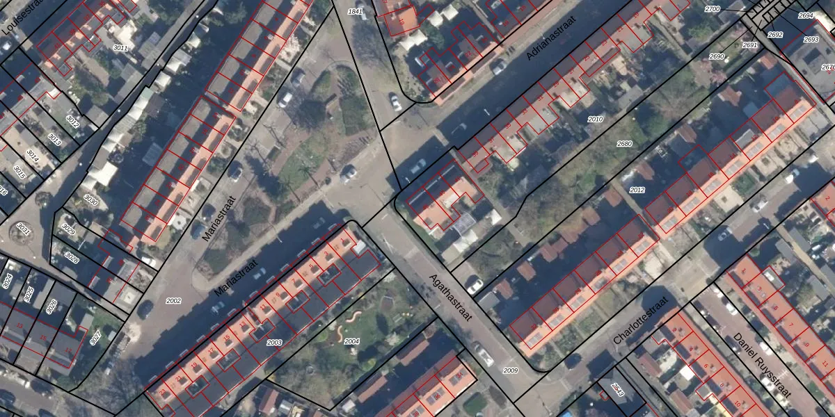 Het perceel waarop Adrianastraat 45 staat heeft een oppervlakte van 2755 m². Dit is een zeer groot perceel. De perceeloppervlakte wordt geregistreerd door het Kadaster. Gedetailleerde informatie over de maten van dit perceel kunt u vinden in het rapport Kadastrale kaart met maatvoering van Adrianastraat 45.