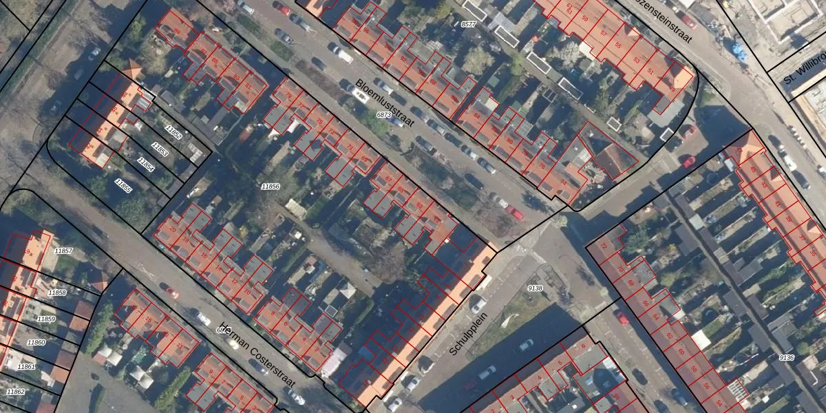 Het perceel waarop Bloemluststraat 63 staat heeft een oppervlakte van 4479 m². Dit is een zeer groot perceel. De perceeloppervlakte wordt geregistreerd door het Kadaster. Gedetailleerde informatie over de maten van dit perceel kunt u vinden in het rapport Kadastrale kaart met maatvoering van Bloemluststraat 63.