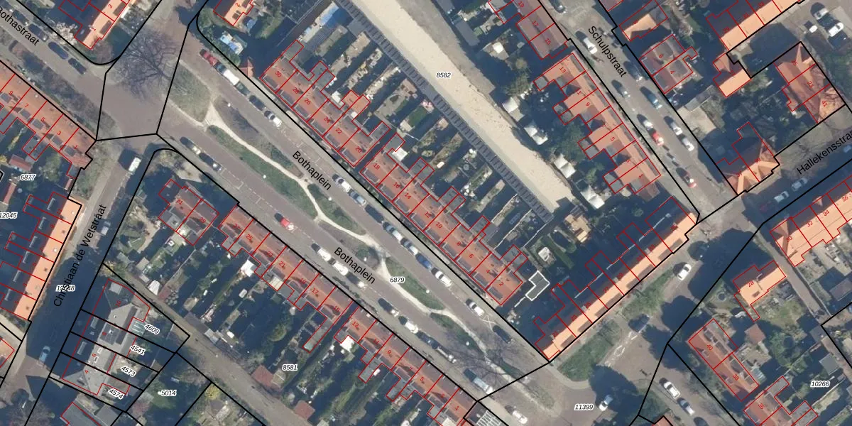 Het perceel waarop Bothaplein 12 staat heeft een oppervlakte van 7217 m². Dit is een zeer groot perceel. De perceeloppervlakte wordt geregistreerd door het Kadaster. Gedetailleerde informatie over de maten van dit perceel kunt u vinden in het rapport Kadastrale kaart met maatvoering van Bothaplein 12.
