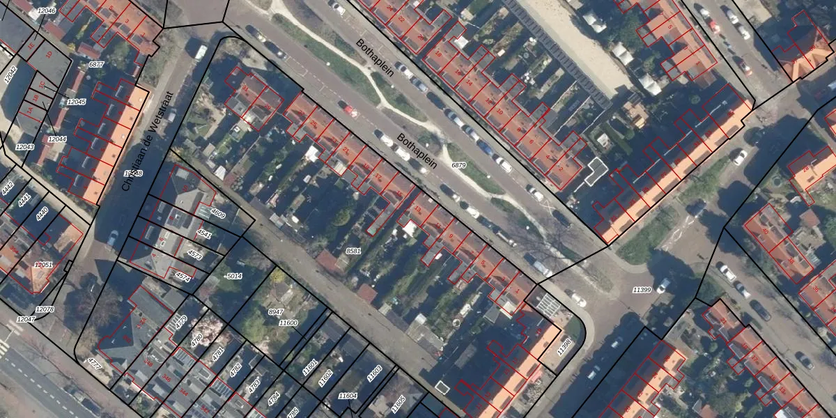 Het perceel waarop Bothaplein 13 staat heeft een oppervlakte van 3672 m². Dit is een zeer groot perceel. De perceeloppervlakte wordt geregistreerd door het Kadaster. Gedetailleerde informatie over de maten van dit perceel kunt u vinden in het rapport Kadastrale kaart met maatvoering van Bothaplein 13.