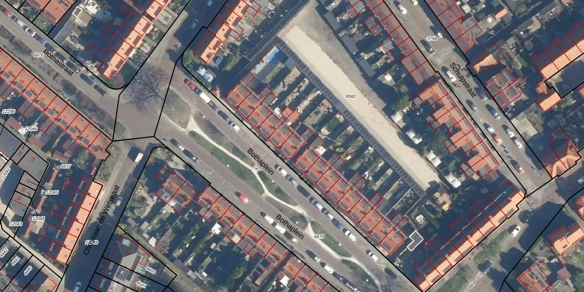 Het perceel waarop Bothaplein 20 staat heeft een oppervlakte van 7217 m². Dit is een zeer groot perceel. De perceeloppervlakte wordt geregistreerd door het Kadaster. Gedetailleerde informatie over de maten van dit perceel kunt u vinden in het rapport Kadastrale kaart met maatvoering van Bothaplein 20.