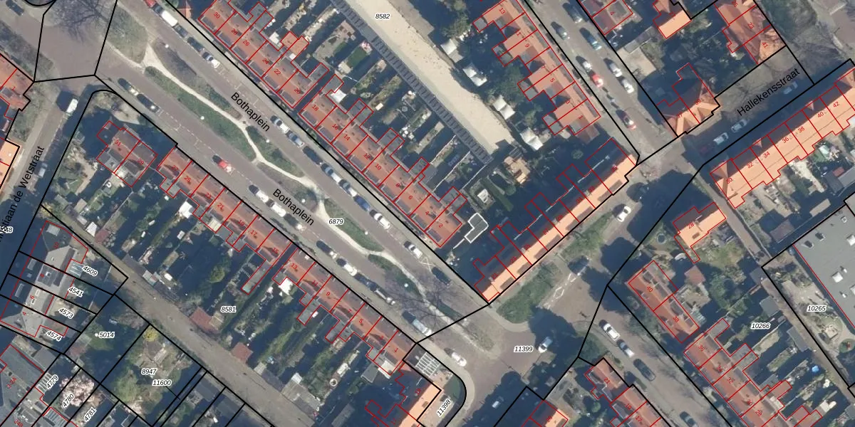 Het perceel waarop Bothaplein 4 staat heeft een oppervlakte van 7217 m². Dit is een zeer groot perceel. De perceeloppervlakte wordt geregistreerd door het Kadaster. Gedetailleerde informatie over de maten van dit perceel kunt u vinden in het rapport Kadastrale kaart met maatvoering van Bothaplein 4.