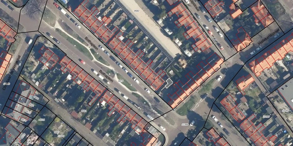 Het perceel waarop Bothaplein 6 staat heeft een oppervlakte van 7217 m². Dit is een zeer groot perceel. De perceeloppervlakte wordt geregistreerd door het Kadaster. Gedetailleerde informatie over de maten van dit perceel kunt u vinden in het rapport Kadastrale kaart met maatvoering van Bothaplein 6.