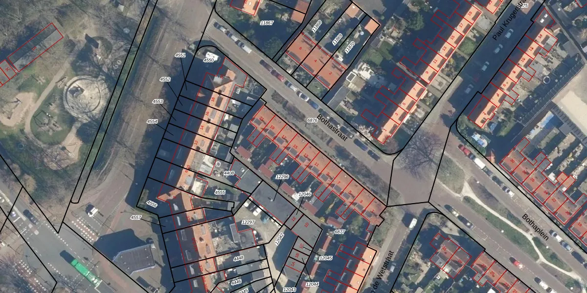 Het perceel waarop Bothastraat 15 staat heeft een oppervlakte van 1757 m². Dit is een zeer groot perceel. De perceeloppervlakte wordt geregistreerd door het Kadaster. Gedetailleerde informatie over de maten van dit perceel kunt u vinden in het rapport Kadastrale kaart met maatvoering van Bothastraat 15.