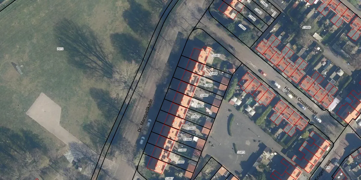 Het perceel waarop Dr. Mansveltkade 36 staat heeft een oppervlakte van 196 m². Dit is een middelgroot perceel. De perceeloppervlakte wordt geregistreerd door het Kadaster. Gedetailleerde informatie over de maten van dit perceel kunt u vinden in het rapport Kadastrale kaart met maatvoering van Dr. Mansveltkade 36.