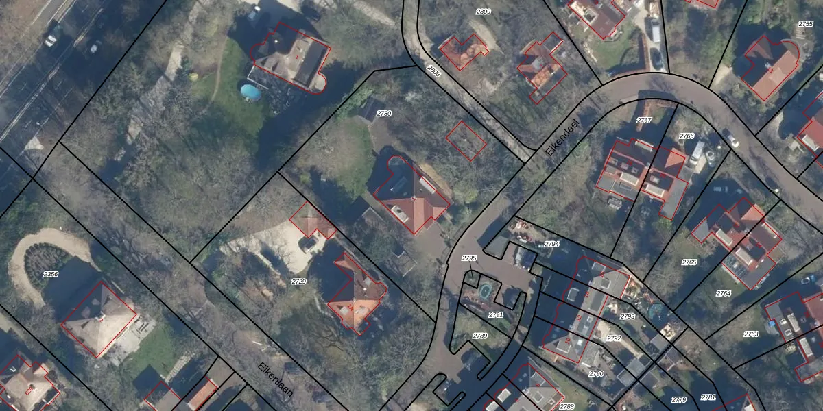 Het perceel waarop Eikendael 1 staat heeft een oppervlakte van 1863 m². Dit is een zeer groot perceel. De perceeloppervlakte wordt geregistreerd door het Kadaster. Gedetailleerde informatie over de maten van dit perceel kunt u vinden in het rapport Kadastrale kaart met maatvoering van Eikendael 1.