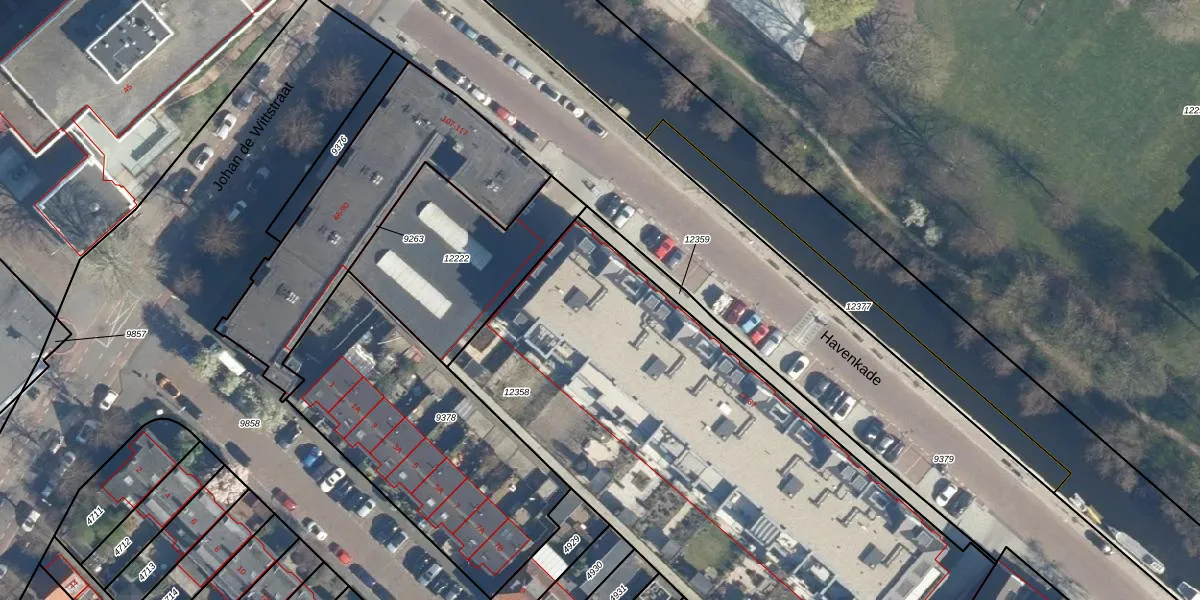 Het perceel waarop Havenkade 77 staat heeft een oppervlakte van 3386 m². Dit is een zeer groot perceel. De perceeloppervlakte wordt geregistreerd door het Kadaster. Gedetailleerde informatie over de maten van dit perceel kunt u vinden in het rapport Kadastrale kaart met maatvoering van Havenkade 77.