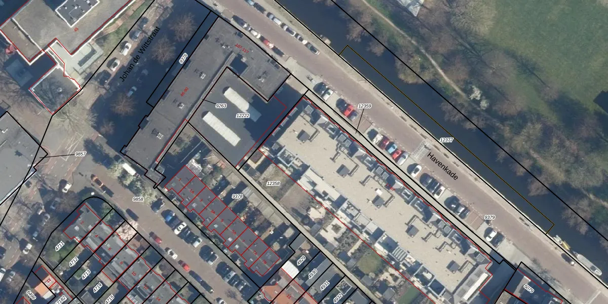Het perceel waarop Havenkade 79 staat heeft een oppervlakte van 3386 m². Dit is een zeer groot perceel. De perceeloppervlakte wordt geregistreerd door het Kadaster. Gedetailleerde informatie over de maten van dit perceel kunt u vinden in het rapport Kadastrale kaart met maatvoering van Havenkade 79.