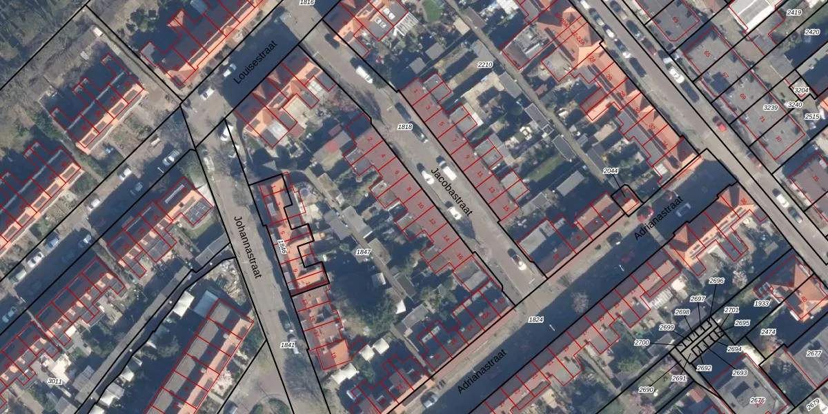 Het perceel waarop Jacobastraat 10 staat heeft een oppervlakte van 3070 m². Dit is een zeer groot perceel. De perceeloppervlakte wordt geregistreerd door het Kadaster. Gedetailleerde informatie over de maten van dit perceel kunt u vinden in het rapport Kadastrale kaart met maatvoering van Jacobastraat 10.