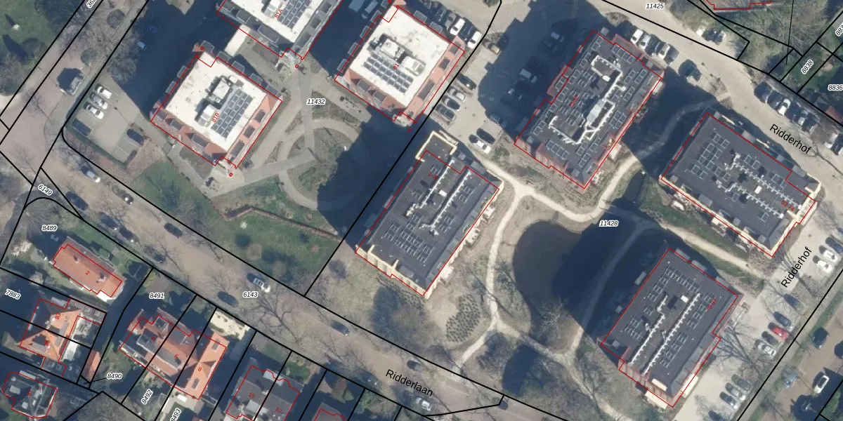 Het perceel waarop Ridderhof 18 staat heeft een oppervlakte van 9197 m². Dit is een zeer groot perceel. De perceeloppervlakte wordt geregistreerd door het Kadaster. Gedetailleerde informatie over de maten van dit perceel kunt u vinden in het rapport Kadastrale kaart met maatvoering van Ridderhof 18.