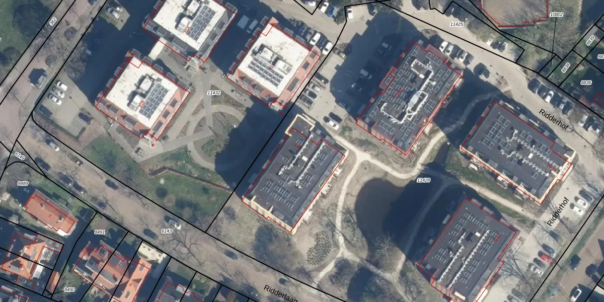Het perceel waarop Ridderhof 19 staat heeft een oppervlakte van 9197 m². Dit is een zeer groot perceel. De perceeloppervlakte wordt geregistreerd door het Kadaster. Gedetailleerde informatie over de maten van dit perceel kunt u vinden in het rapport Kadastrale kaart met maatvoering van Ridderhof 19.