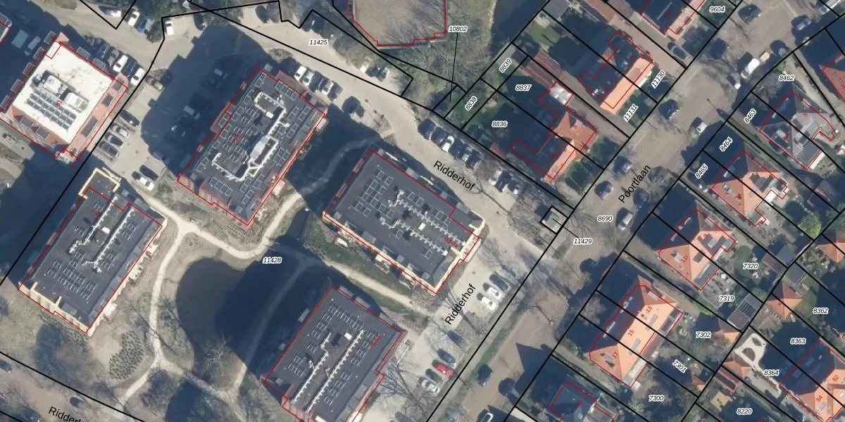 Het perceel waarop Ridderhof 61 staat heeft een oppervlakte van 9197 m². Dit is een zeer groot perceel. De perceeloppervlakte wordt geregistreerd door het Kadaster. Gedetailleerde informatie over de maten van dit perceel kunt u vinden in het rapport Kadastrale kaart met maatvoering van Ridderhof 61.