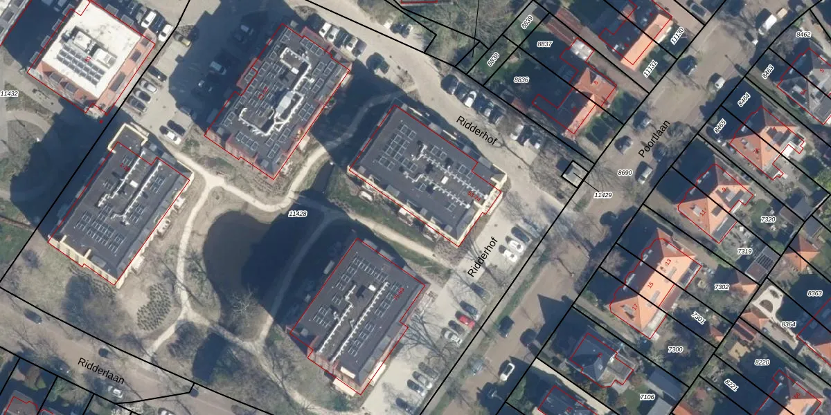 Het perceel waarop Ridderhof 64 staat heeft een oppervlakte van 9197 m². Dit is een zeer groot perceel. De perceeloppervlakte wordt geregistreerd door het Kadaster. Gedetailleerde informatie over de maten van dit perceel kunt u vinden in het rapport Kadastrale kaart met maatvoering van Ridderhof 64.