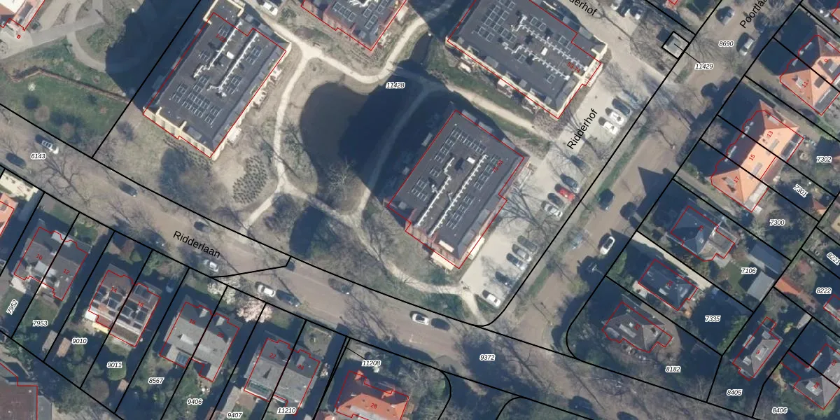 Het perceel waarop Ridderhof 80 staat heeft een oppervlakte van 9197 m². Dit is een zeer groot perceel. De perceeloppervlakte wordt geregistreerd door het Kadaster. Gedetailleerde informatie over de maten van dit perceel kunt u vinden in het rapport Kadastrale kaart met maatvoering van Ridderhof 80.