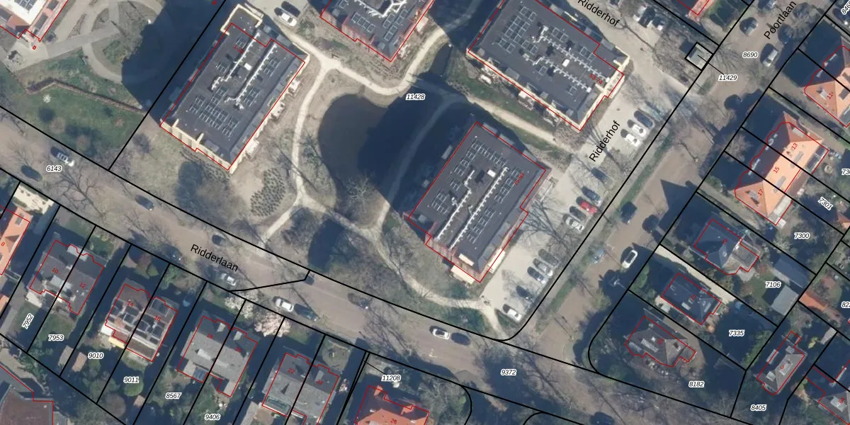 Het perceel waarop Ridderhof 90 staat heeft een oppervlakte van 9197 m². Dit is een zeer groot perceel. De perceeloppervlakte wordt geregistreerd door het Kadaster. Gedetailleerde informatie over de maten van dit perceel kunt u vinden in het rapport Kadastrale kaart met maatvoering van Ridderhof 90.