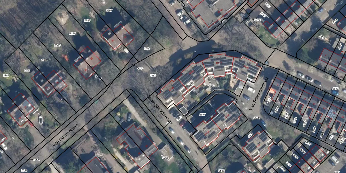 Het perceel waarop Van Bommellaan 46 staat heeft een oppervlakte van 1233 m². Dit is een zeer groot perceel. De perceeloppervlakte wordt geregistreerd door het Kadaster. Gedetailleerde informatie over de maten van dit perceel kunt u vinden in het rapport Kadastrale kaart met maatvoering van Van Bommellaan 46.