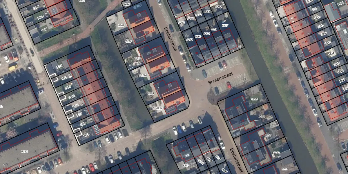 Boetersstraat 25 is gelegen op kadastraal perceel WTR00A8224. Deze kadastrale aanduiding is uniek en wordt gebruikt door het Kadaster om eigendomsrechten en andere zakelijke rechten vast te leggen. Het perceel maakt onderdeel uit van de kadastrale gemeente Wateringen.