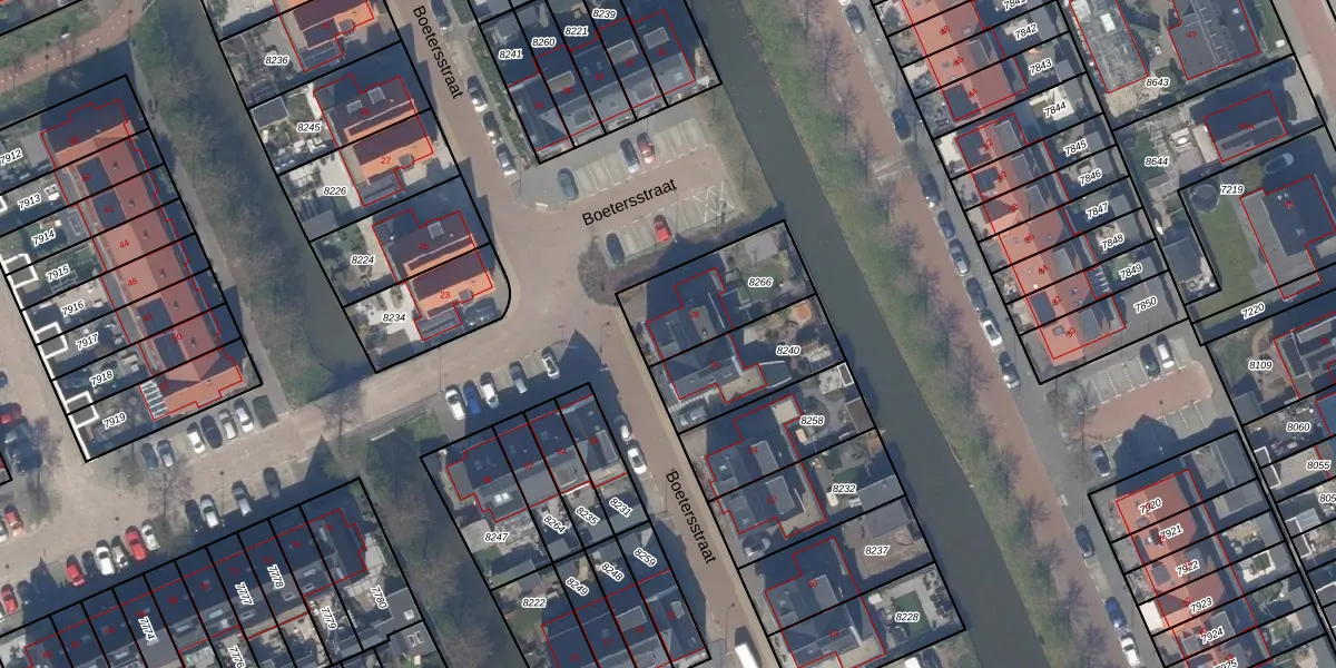 Boetersstraat 28 is gelegen op kadastraal perceel WTR00A8266. Deze kadastrale aanduiding is uniek en wordt gebruikt door het Kadaster om eigendomsrechten en andere zakelijke rechten vast te leggen. Het perceel maakt onderdeel uit van de kadastrale gemeente Wateringen.