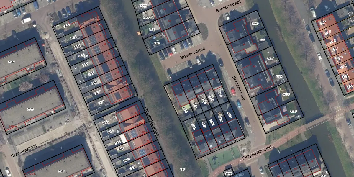 Boetersstraat 53 is gelegen op kadastraal perceel WTR00A8284. Deze kadastrale aanduiding is uniek en wordt gebruikt door het Kadaster om eigendomsrechten en andere zakelijke rechten vast te leggen. Het perceel maakt onderdeel uit van de kadastrale gemeente Wateringen.