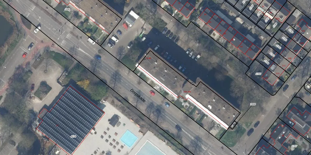Het perceel waarop Dorpskade 76 staat heeft een oppervlakte van 1390 m². Dit is een zeer groot perceel. De perceeloppervlakte wordt geregistreerd door het Kadaster. Gedetailleerde informatie over de maten van dit perceel kunt u vinden in het rapport Kadastrale kaart met maatvoering van Dorpskade 76.