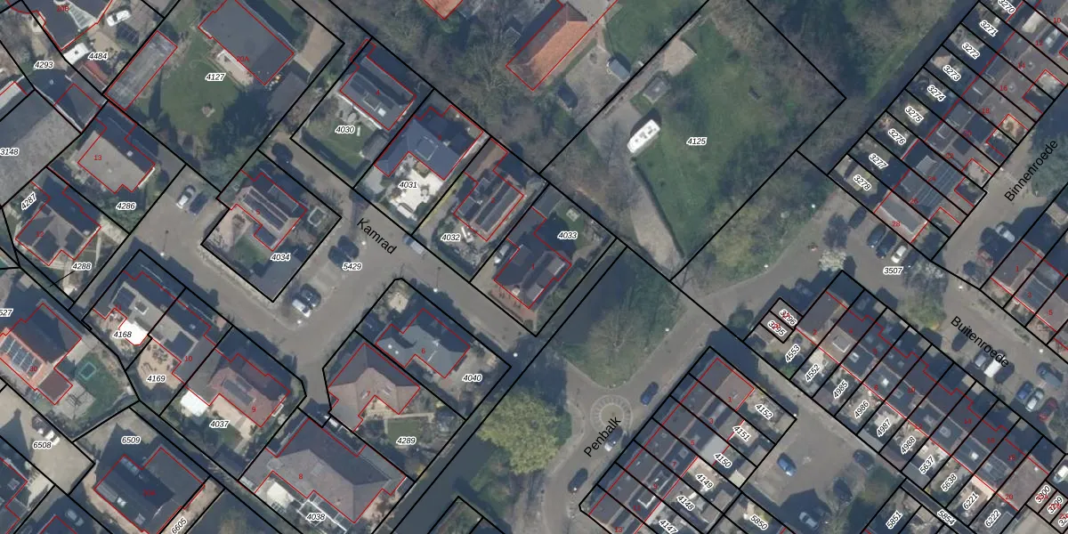 Het perceel waarop Kamrad 1 staat heeft een oppervlakte van 382 m². Dit is een groot perceel. De perceeloppervlakte wordt geregistreerd door het Kadaster. Gedetailleerde informatie over de maten van dit perceel kunt u vinden in het rapport Kadastrale kaart met maatvoering van Kamrad 1.