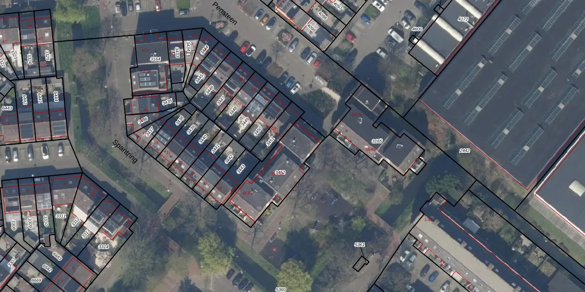 Het perceel waarop Spantring 45 staat heeft een oppervlakte van 504 m². Dit is een groot perceel. De perceeloppervlakte wordt geregistreerd door het Kadaster. Gedetailleerde informatie over de maten van dit perceel kunt u vinden in het rapport Kadastrale kaart met maatvoering van Spantring 45.