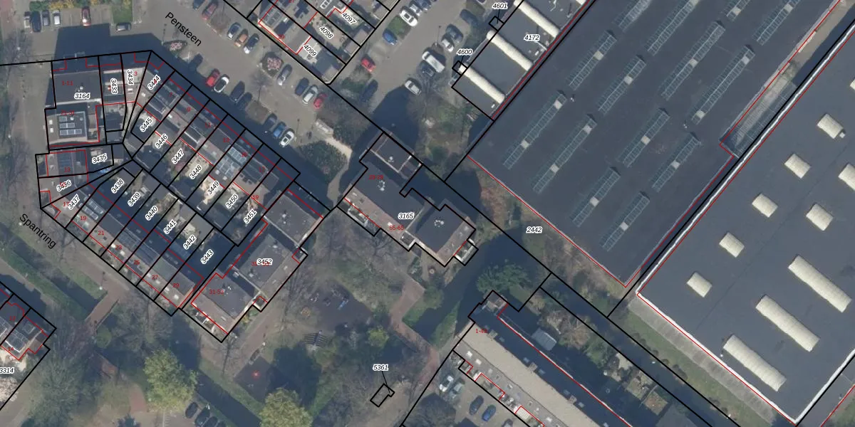 Het perceel waarop Spantring 59 staat heeft een oppervlakte van 454 m². Dit is een groot perceel. De perceeloppervlakte wordt geregistreerd door het Kadaster. Gedetailleerde informatie over de maten van dit perceel kunt u vinden in het rapport Kadastrale kaart met maatvoering van Spantring 59.