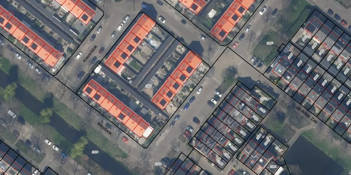 Het perceel waarop Westblok 40 staat heeft een oppervlakte van 3082 m². Dit is een zeer groot perceel. De perceeloppervlakte wordt geregistreerd door het Kadaster. Gedetailleerde informatie over de maten van dit perceel kunt u vinden in het rapport Kadastrale kaart met maatvoering van Westblok 40.