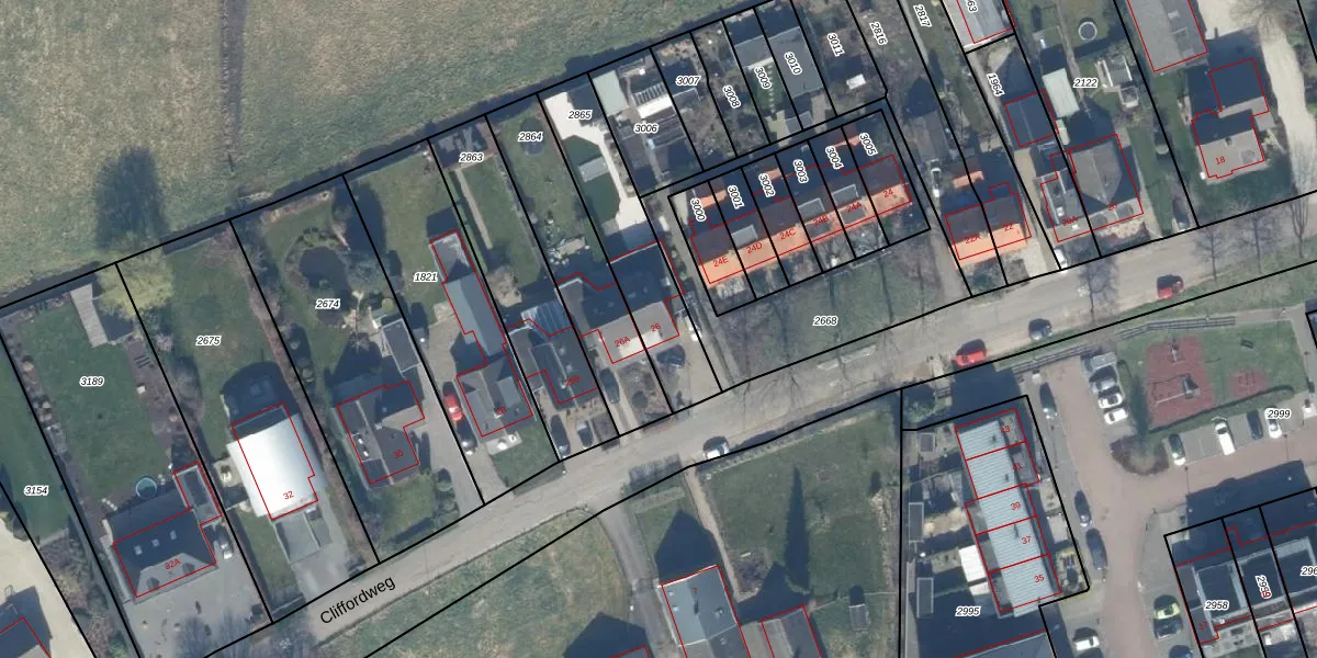 Het perceel waarop Cliffordweg 26 staat heeft een oppervlakte van 425 m². Dit is een groot perceel. De perceeloppervlakte wordt geregistreerd door het Kadaster. Gedetailleerde informatie over de maten van dit perceel kunt u vinden in het rapport Kadastrale kaart met maatvoering van Cliffordweg 26.