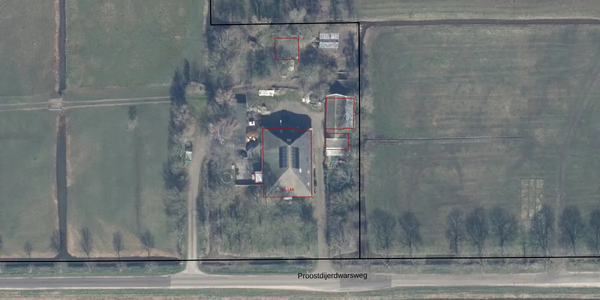 Het perceel waarop Proostdijerdwarsweg 14-A staat heeft een oppervlakte van 6,8 ha. Dit is een zeer groot perceel. De perceeloppervlakte wordt geregistreerd door het Kadaster. Gedetailleerde informatie over de maten van dit perceel kunt u vinden in het rapport Kadastrale kaart met maatvoering van Proostdijerdwarsweg 14-A.