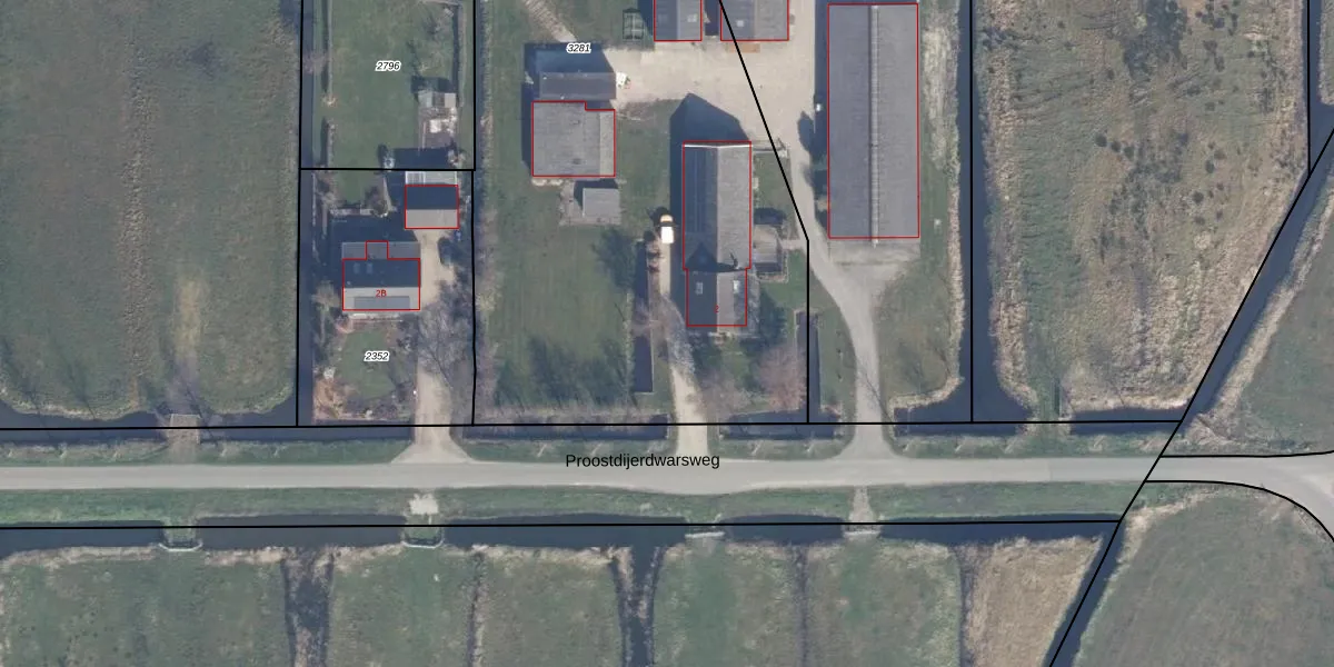 Het perceel waarop Proostdijerdwarsweg 2 staat heeft een oppervlakte van 3775 m². Dit is een zeer groot perceel. De perceeloppervlakte wordt geregistreerd door het Kadaster. Gedetailleerde informatie over de maten van dit perceel kunt u vinden in het rapport Kadastrale kaart met maatvoering van Proostdijerdwarsweg 2.