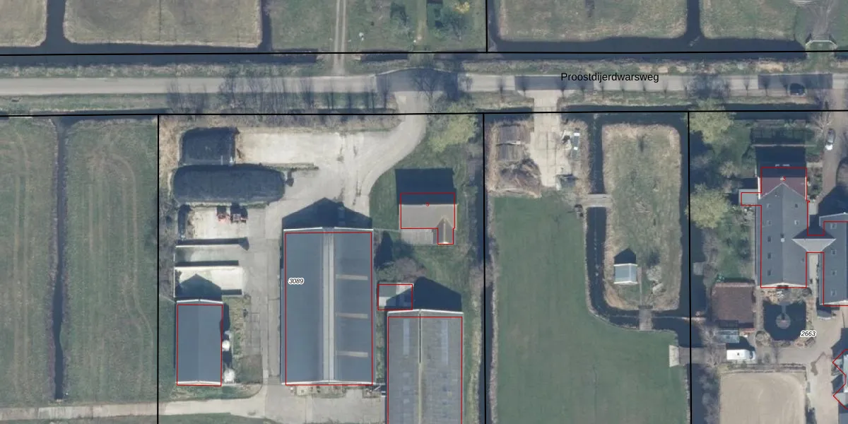 Het perceel waarop Proostdijerdwarsweg 5 staat heeft een oppervlakte van 7000 m². Dit is een zeer groot perceel. De perceeloppervlakte wordt geregistreerd door het Kadaster. Gedetailleerde informatie over de maten van dit perceel kunt u vinden in het rapport Kadastrale kaart met maatvoering van Proostdijerdwarsweg 5.