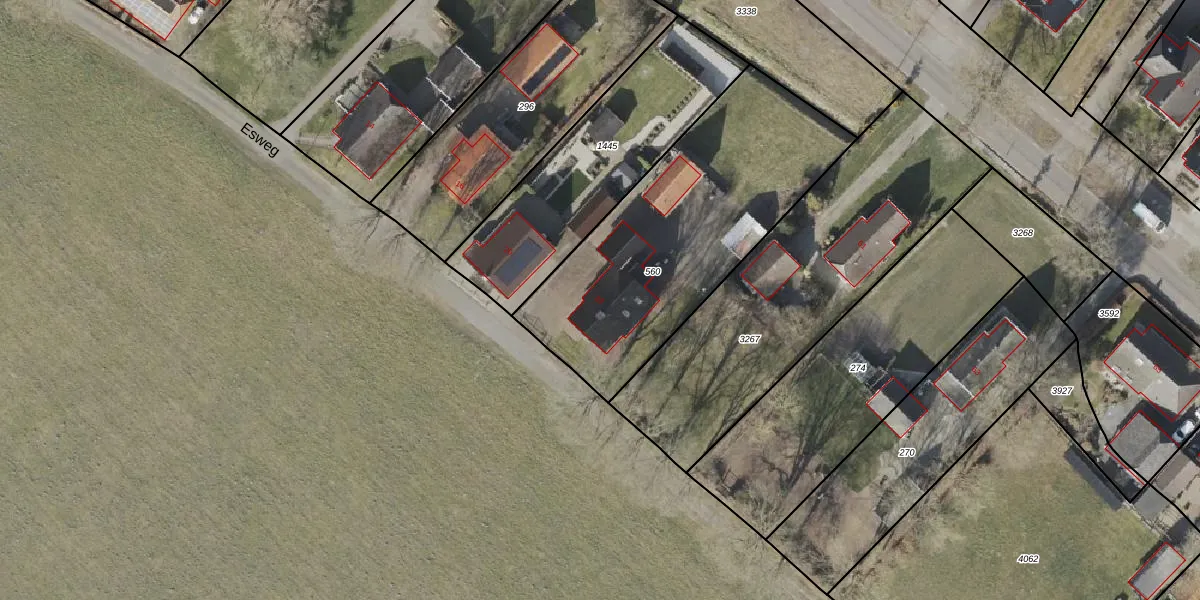 Esweg 22 is gelegen op kadastraal perceel WDE03D560. Deze kadastrale aanduiding is uniek en wordt gebruikt door het Kadaster om eigendomsrechten en andere zakelijke rechten vast te leggen. Het perceel maakt onderdeel uit van de kadastrale gemeente Wedde.