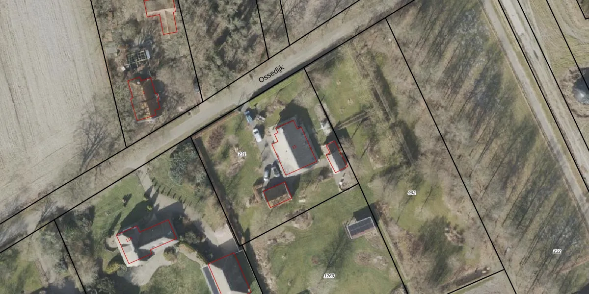 Het perceel waarop Ossedijk 11 staat heeft een oppervlakte van 1916 m². Dit is een zeer groot perceel. De perceeloppervlakte wordt geregistreerd door het Kadaster. Gedetailleerde informatie over de maten van dit perceel kunt u vinden in het rapport Kadastrale kaart met maatvoering van Ossedijk 11.
