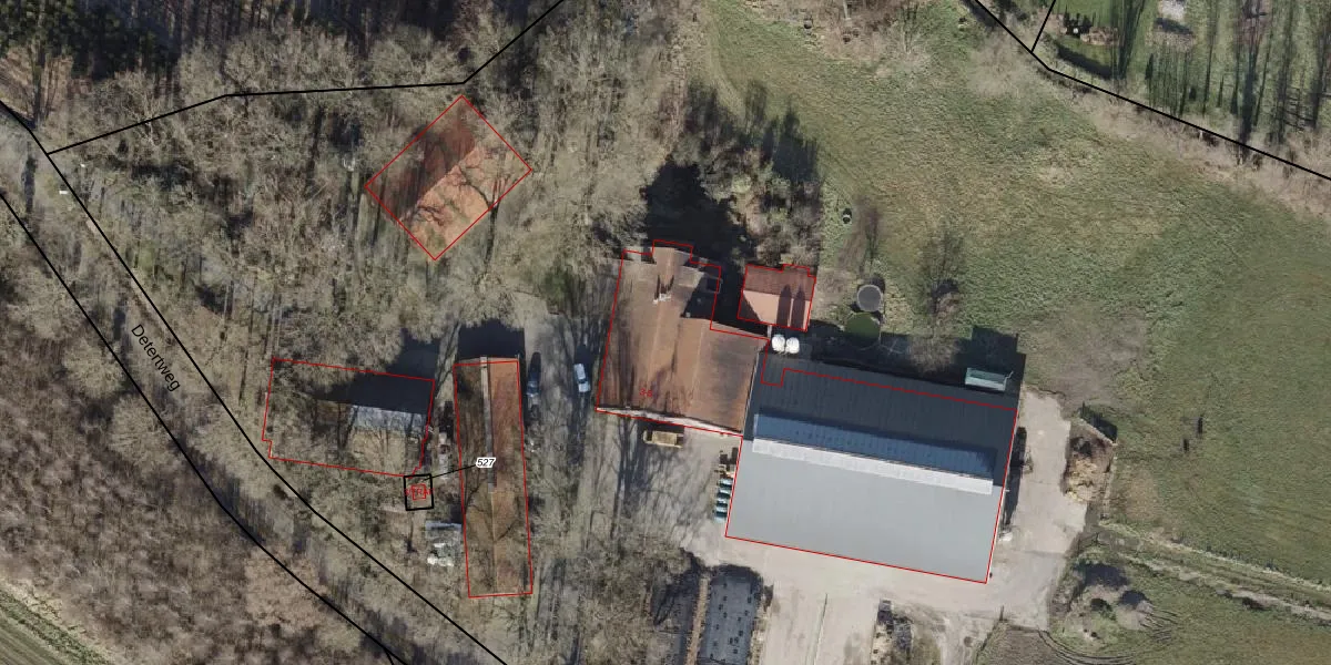 Het perceel waarop Detertweg 3 staat heeft een oppervlakte van 12,4 ha. Dit is een zeer groot perceel. De perceeloppervlakte wordt geregistreerd door het Kadaster. Gedetailleerde informatie over de maten van dit perceel kunt u vinden in het rapport Kadastrale kaart met maatvoering van Detertweg 3.