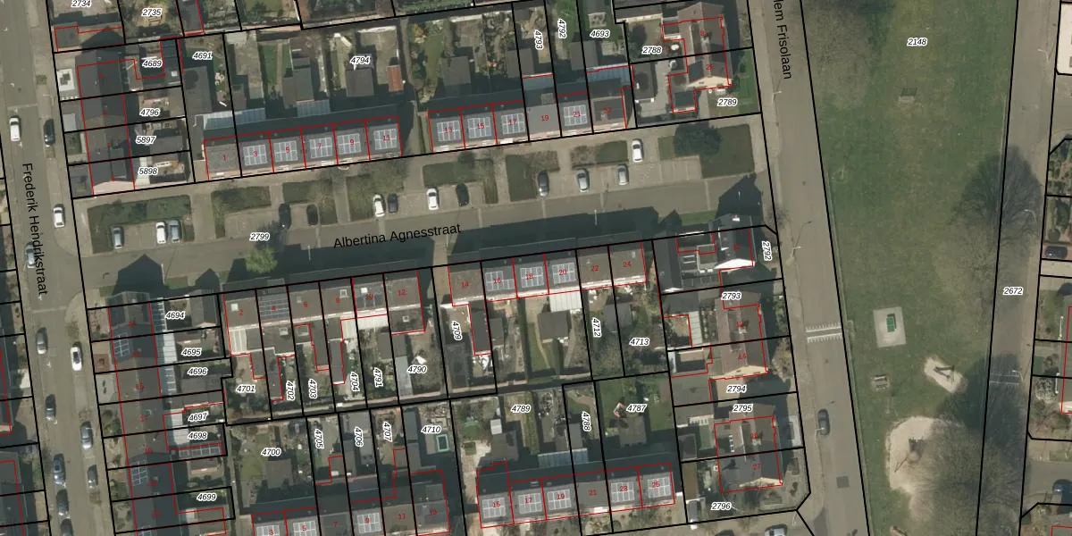 Het perceel waarop Albertina Agnesstraat 18 staat heeft een oppervlakte van 1055 m². Dit is een zeer groot perceel. De perceeloppervlakte wordt geregistreerd door het Kadaster. Gedetailleerde informatie over de maten van dit perceel kunt u vinden in het rapport Kadastrale kaart met maatvoering van Albertina Agnesstraat 18.