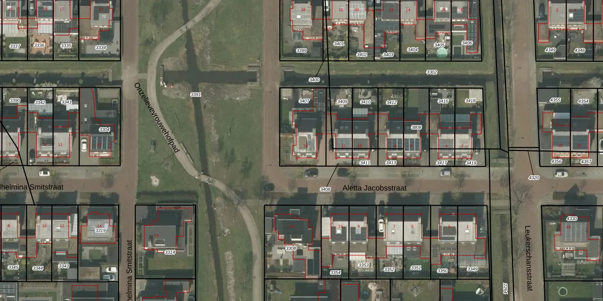 Het perceel waarop Aletta Jacobsstraat 14 staat heeft een oppervlakte van 400 m². Dit is een groot perceel. De perceeloppervlakte wordt geregistreerd door het Kadaster. Gedetailleerde informatie over de maten van dit perceel kunt u vinden in het rapport Kadastrale kaart met maatvoering van Aletta Jacobsstraat 14.